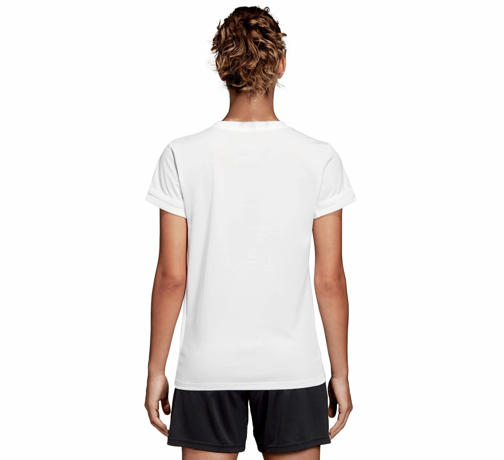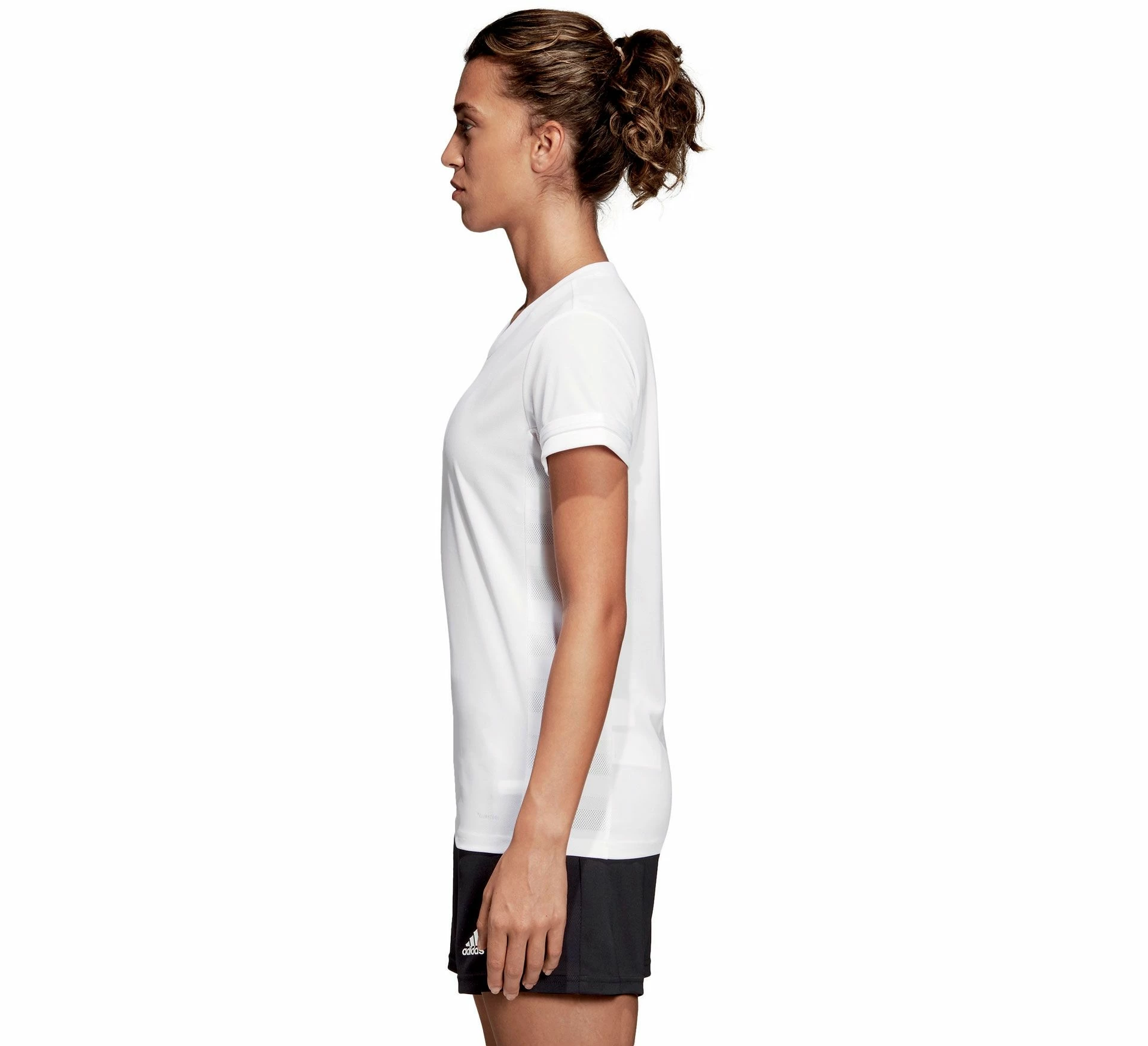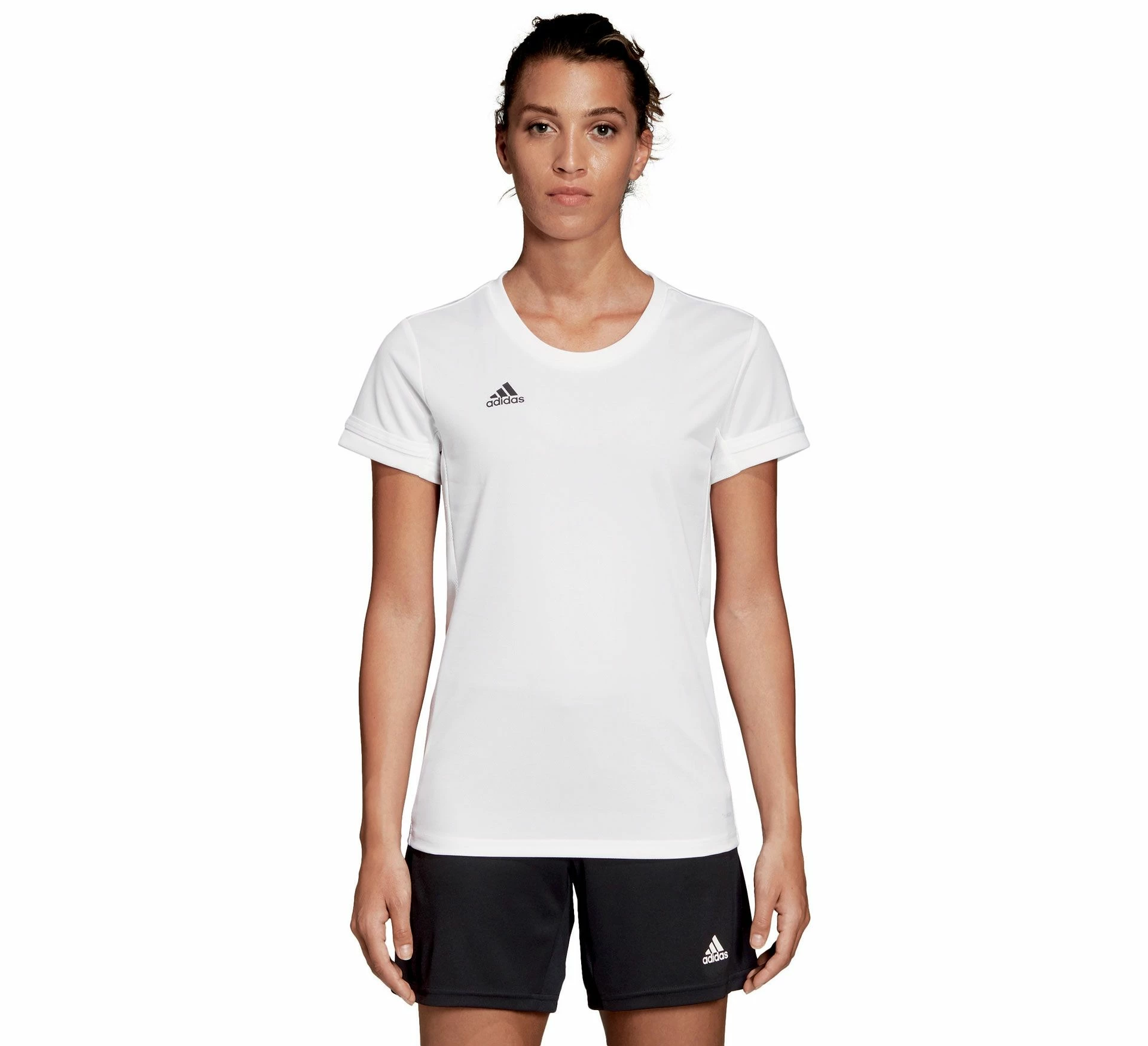 Das Adidas T19 Shirt für Damen ist ein geschmeidiges Polyestershirt mit Mesh-Einsätzen.